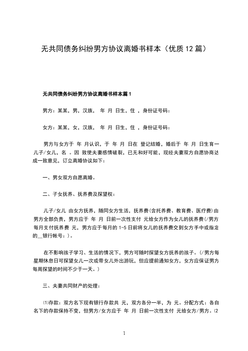 三、债权债务事项:男女双方婚姻存续期间无共同债权债务,任何一方隐瞒债务的,由负债方负责承担,另一方不承担任何责任,无债权债务纠纷。