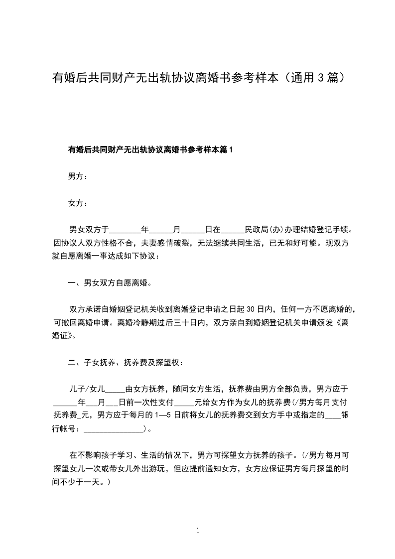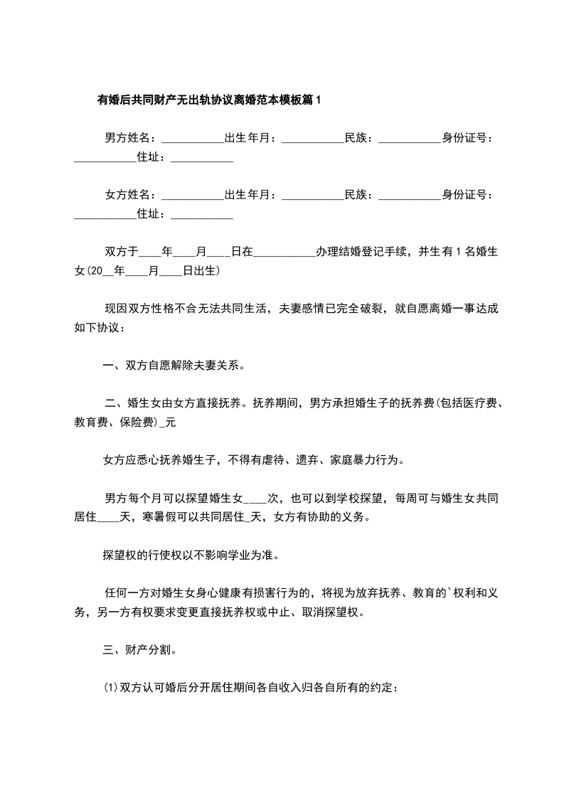 有婚后共同财产无出轨协议离婚书样本篇1