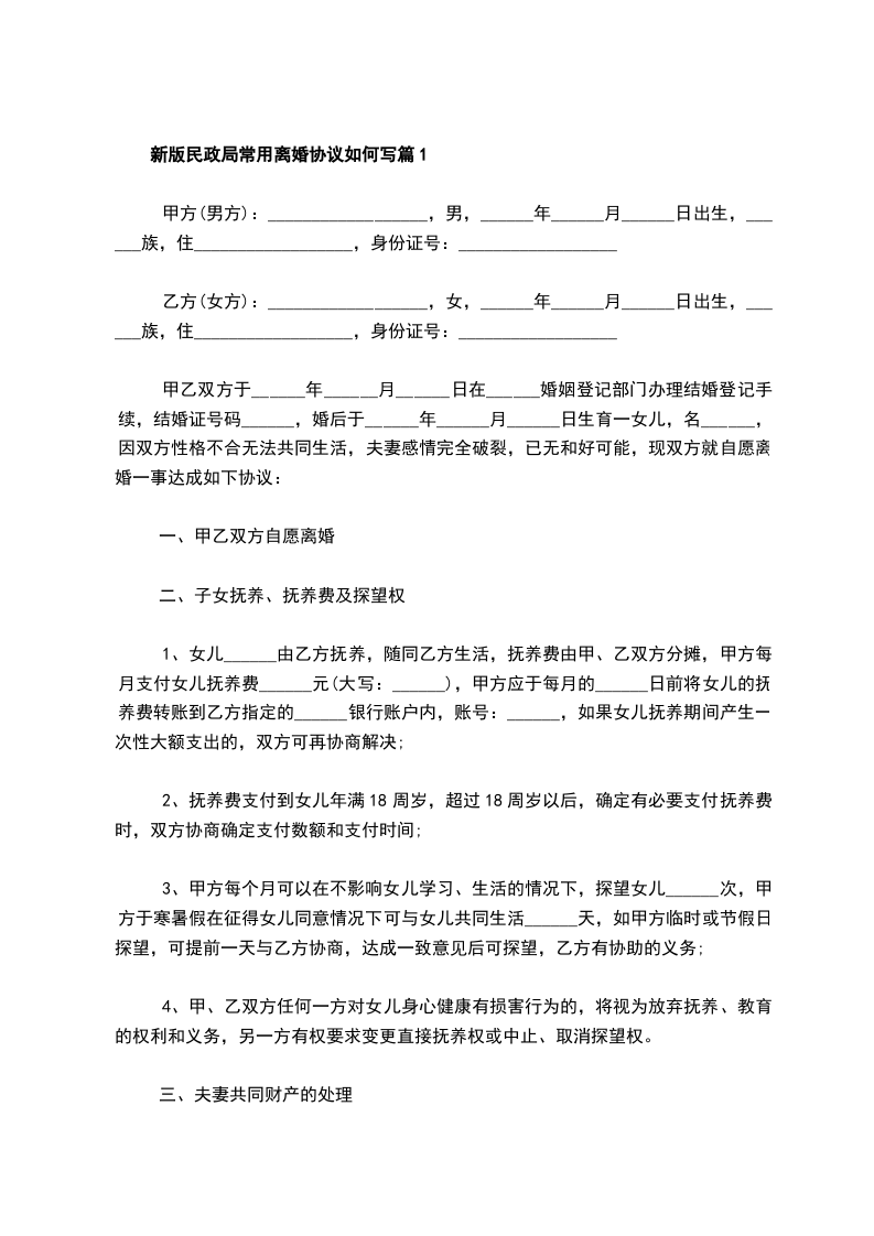 新版民政局常用离婚协议如何写篇1