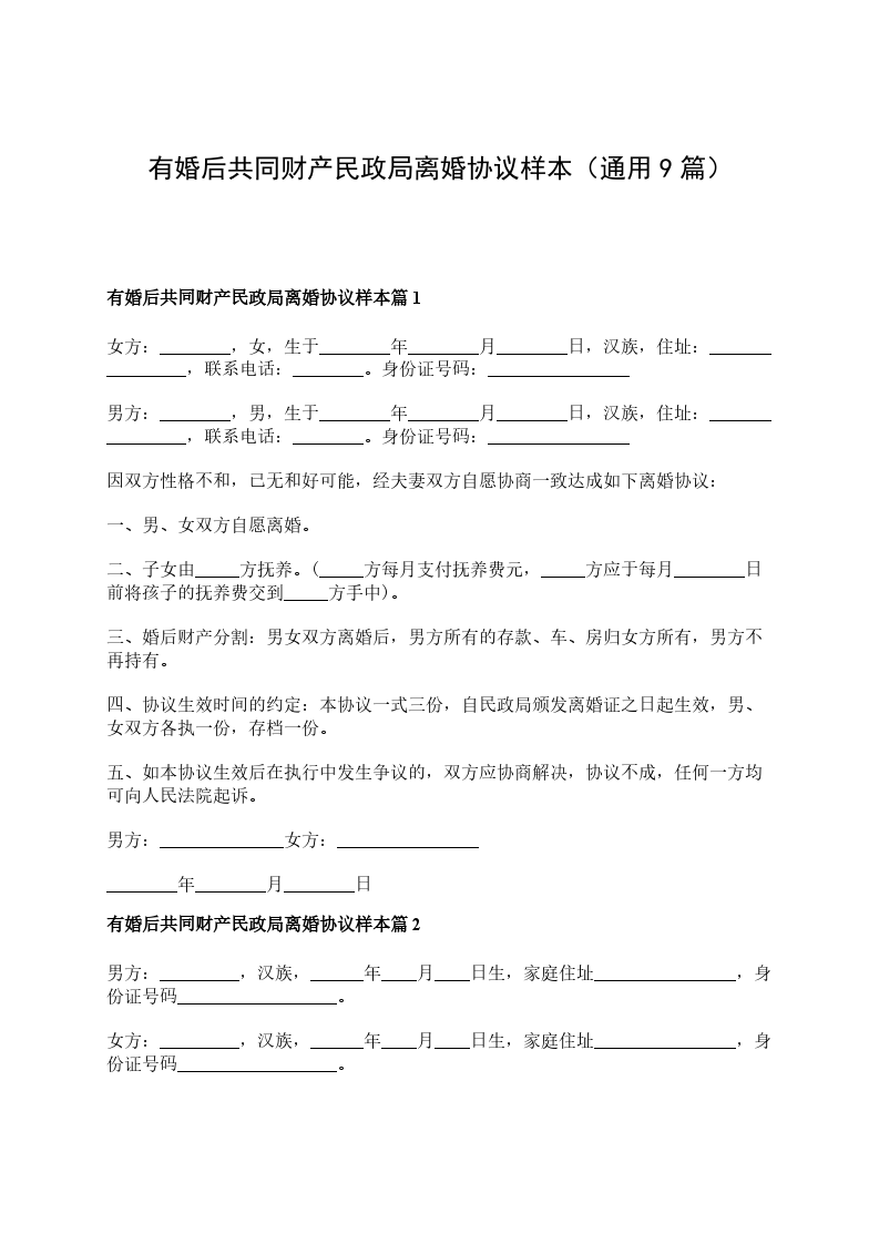 有婚后共同财产民政局离婚协议样本篇9