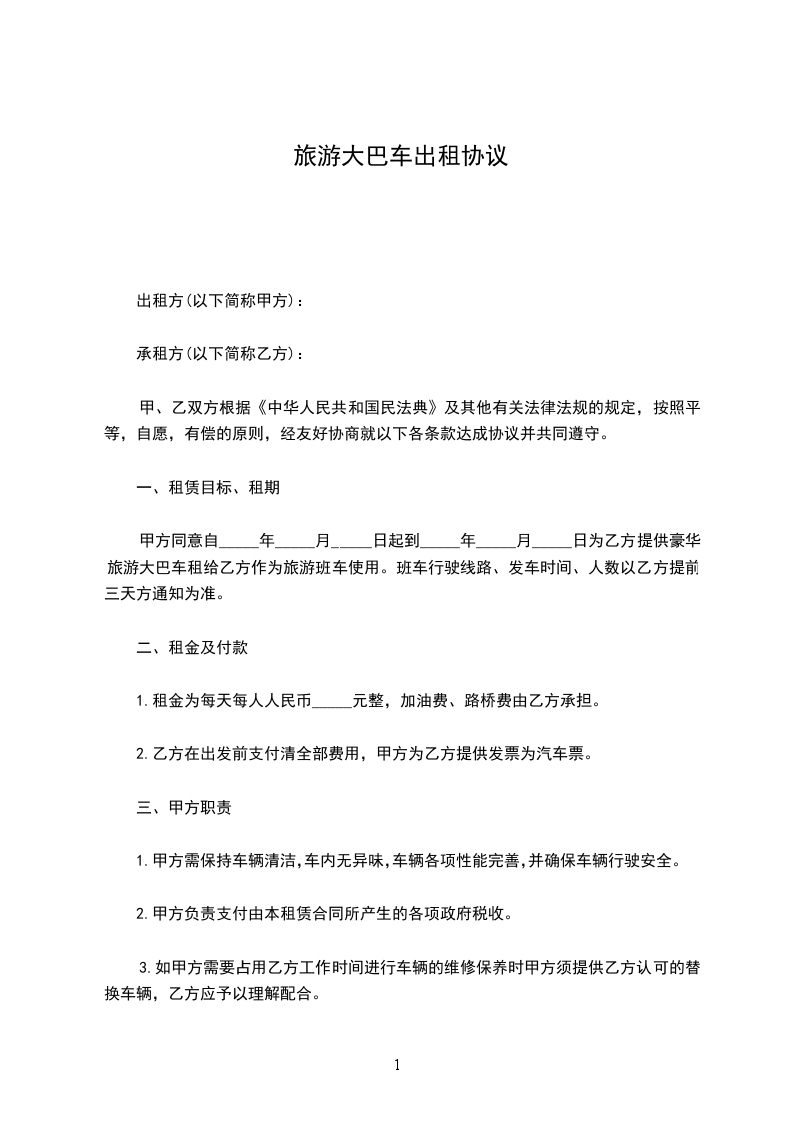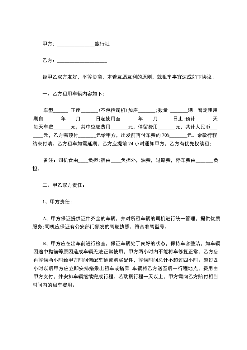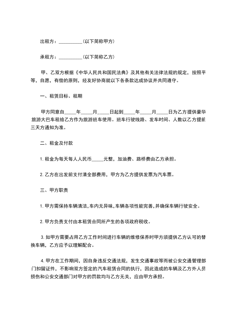 ___________(以下简称甲方)向__________________(以下简称乙方)租用营业大客车,双方同意在顾及安全及权益的原则下,议定合约条款如下: