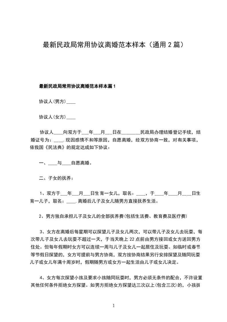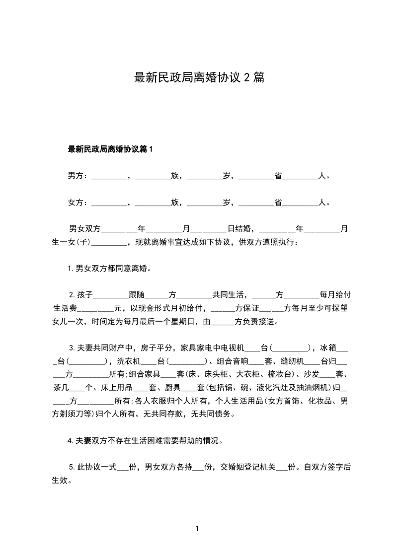 男方__与女方__于____年__月认识,于____年__月__日在__市民政局登记结婚,婚后于____年__月__日生育一儿子,名___。两人因性格不合,致使夫妻感情破裂,已无和好可能,现经夫妻双方自愿协商达成一致意见,订立离婚协议如下: