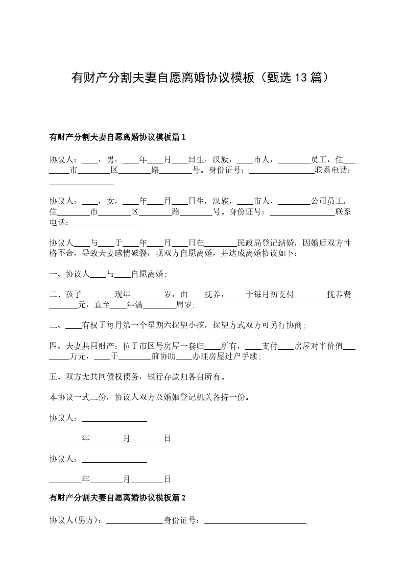 有财产分割夫妻自愿离婚协议模板篇13