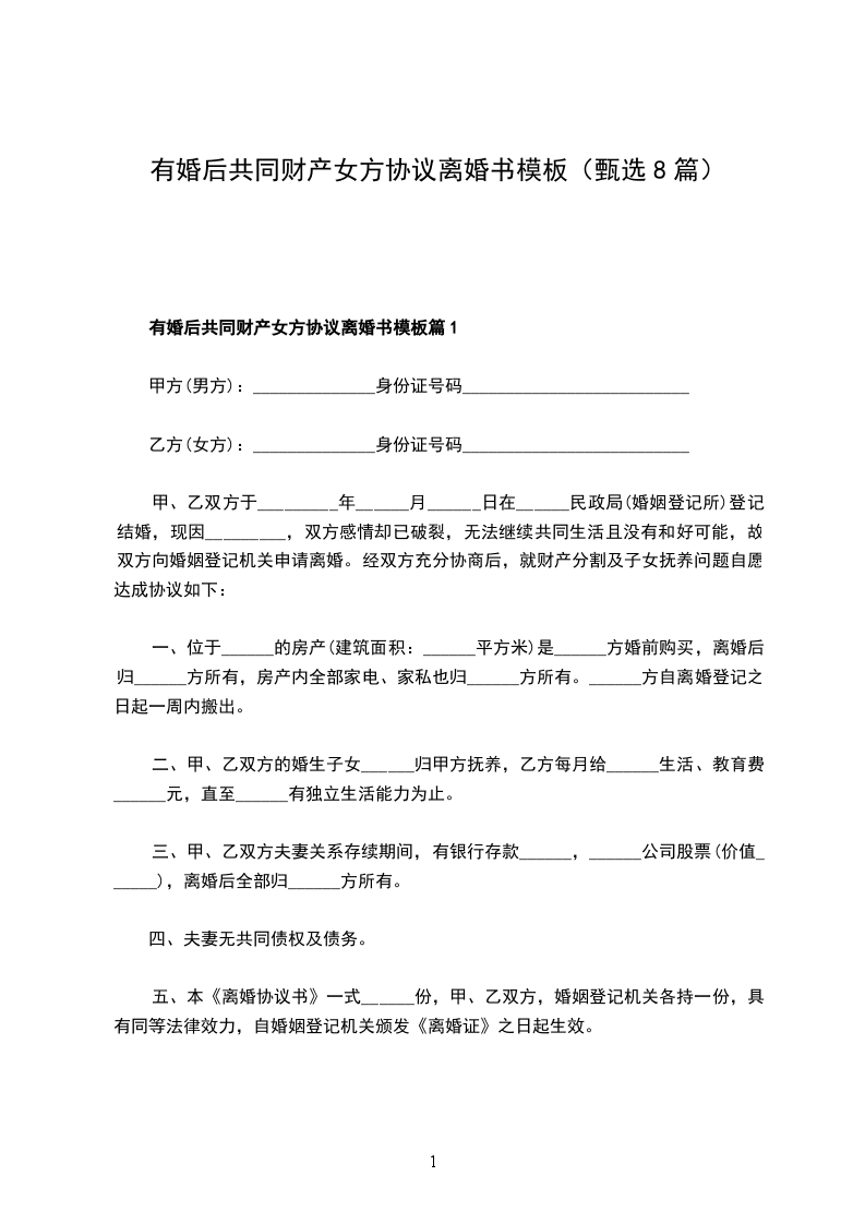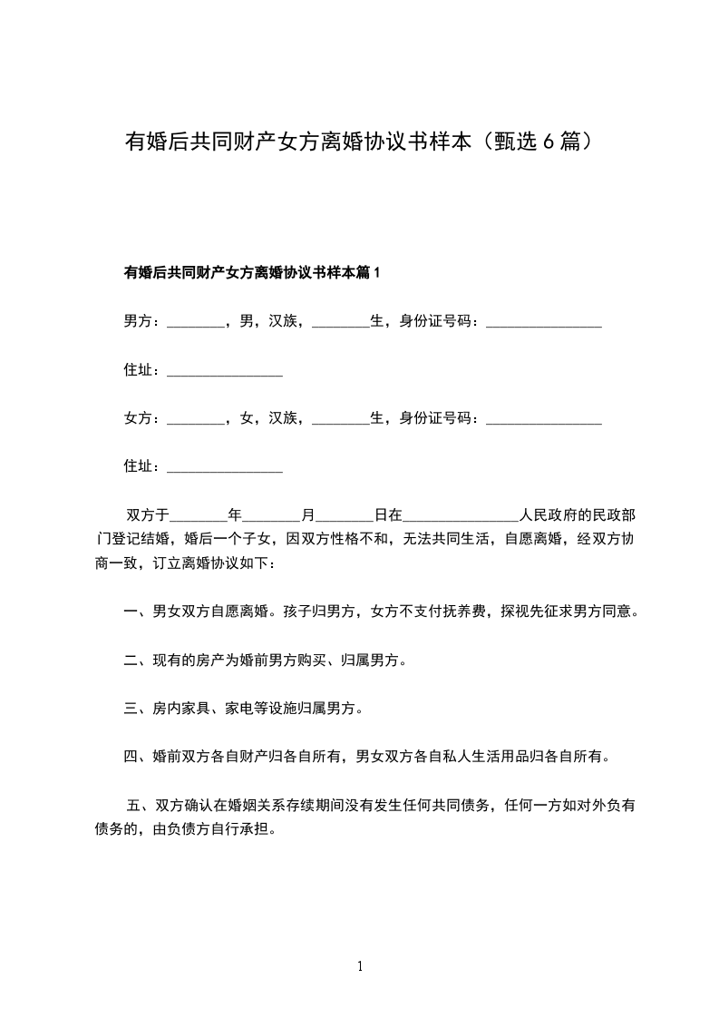 有婚后共同财产女方离婚协议样本篇1