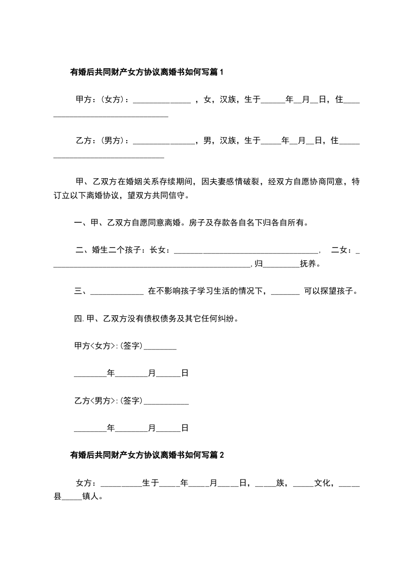 有婚后共同财产女方离婚协议样本篇2