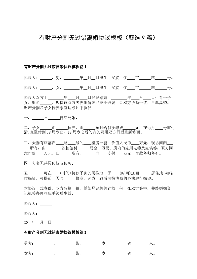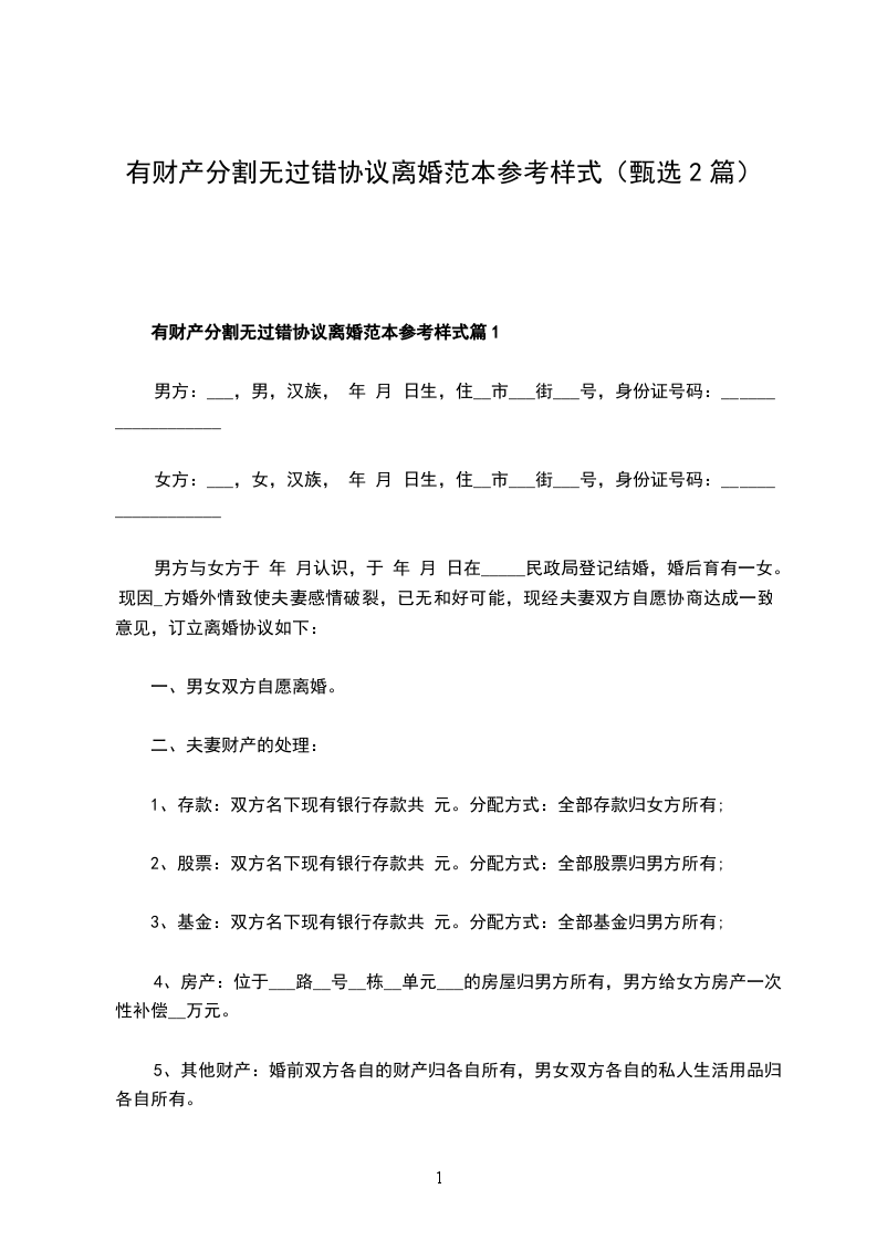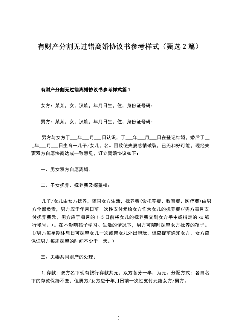 有财产分割无过错离婚协议书模板篇2
