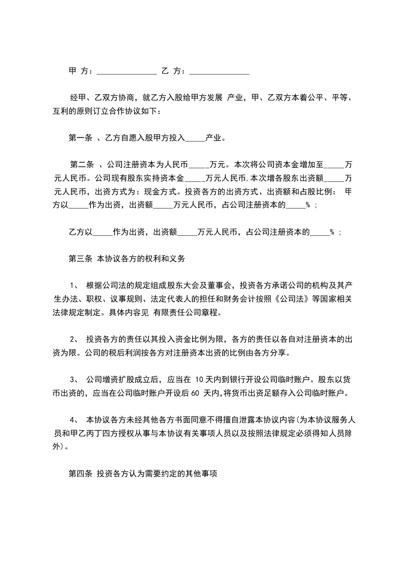 经甲、乙双方协商,就乙方入股给甲方发展 产业,甲、乙双方本着公平、平等、互利的原则订立合作协议如下: