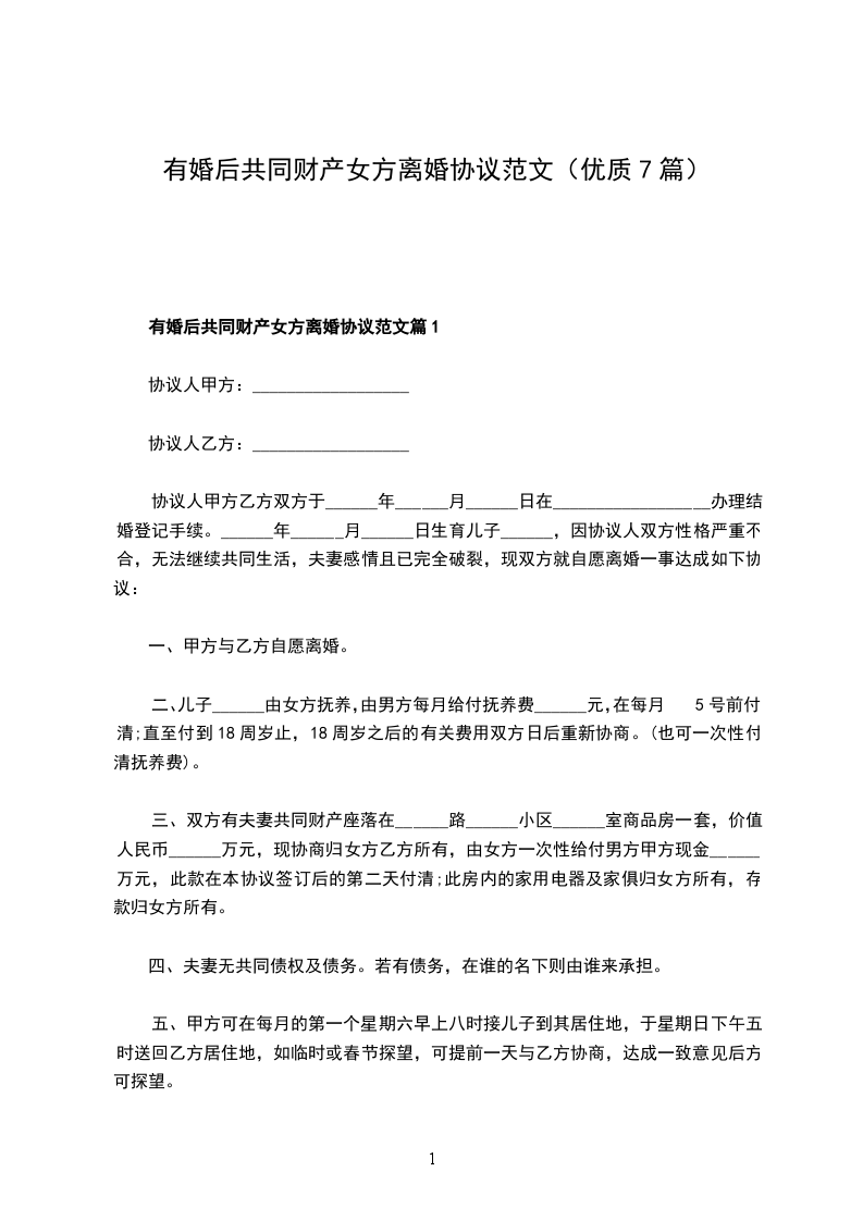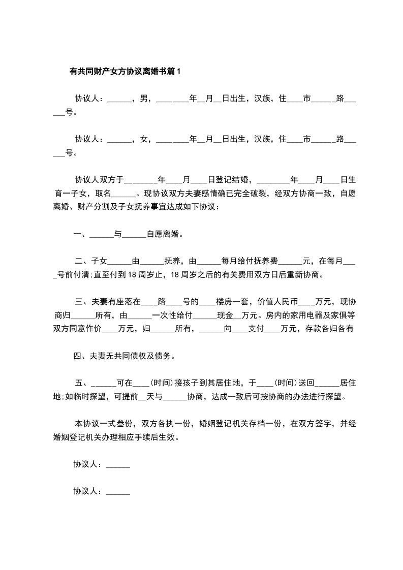 三、双方有夫妻共同财产座落在______路______小区______室商品房一套,价值人民币______万元,现协商归女方乙方所有,由女方一次性给付男方甲方现金______万元,此款在本协议签订后的第二天付清;此房内的家用电器及家俱归女方所有,存款归女方所有。