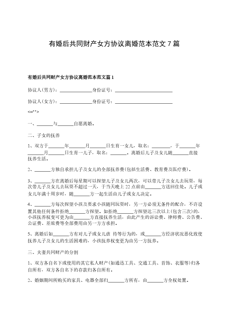八、本协议一式三份,男、女双方各执一份,婚姻登记机关存档一份。