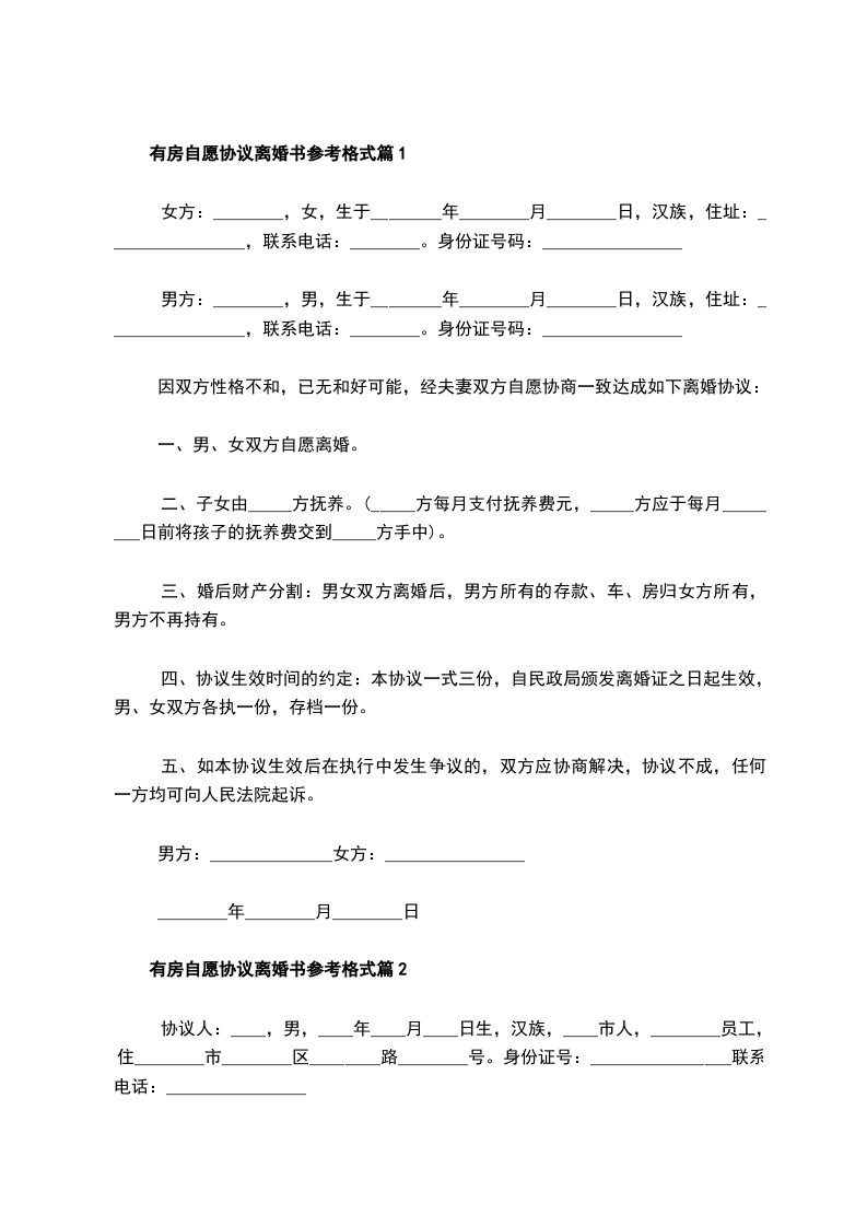 2、离婚协议手续办理后三天内,___方办理房产过户手续,如确实需要,___方应予配合,不得拖延。