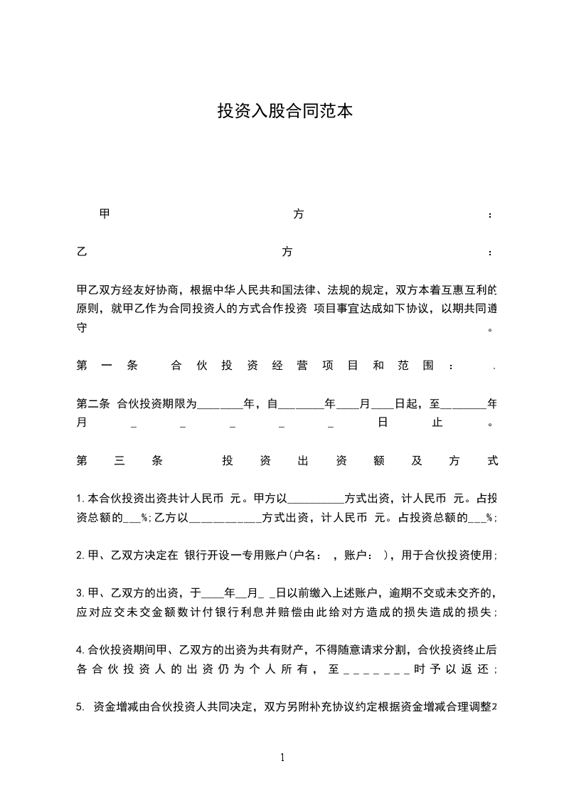 1.本合伙投资出资共计人民币 元。甲方以__________方式出资,计人民币 元。占投资总额的___%;乙方以____________方式出资,计人民币 元。占投资总额的___%;