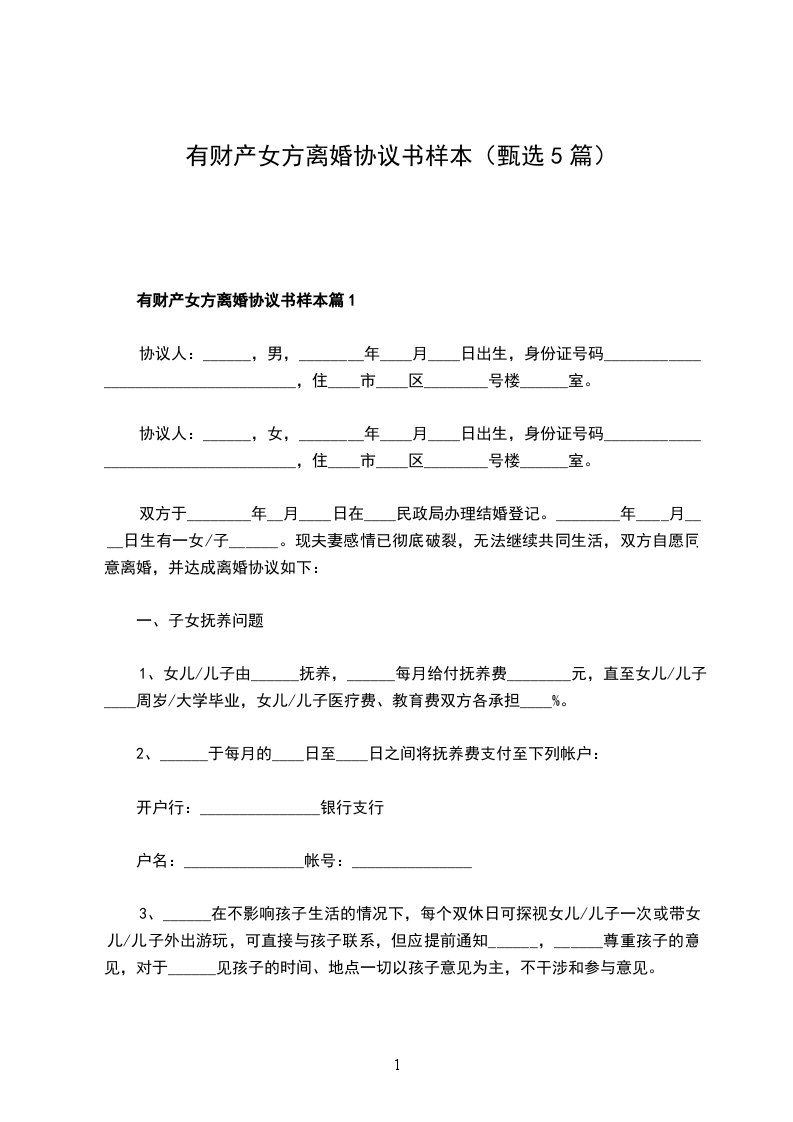 有财产女方离婚协议书样本篇1