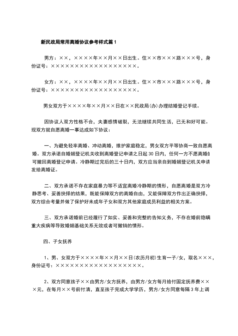 新民政局常用离婚协议参考样式篇2