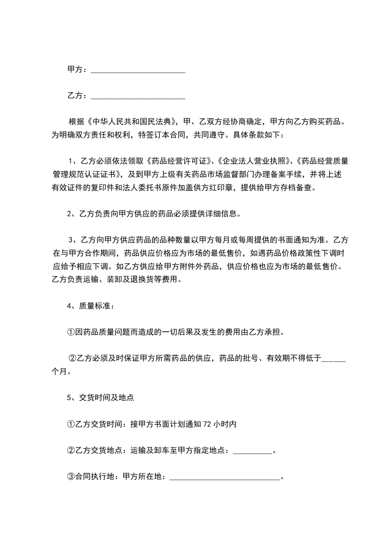 根据《中华人民共和国民法典》,甲、乙双方经协商确定,甲方向乙方购买药品。为明确双方责任和权利,特签订本合同,共同遵守。具体条款如下: