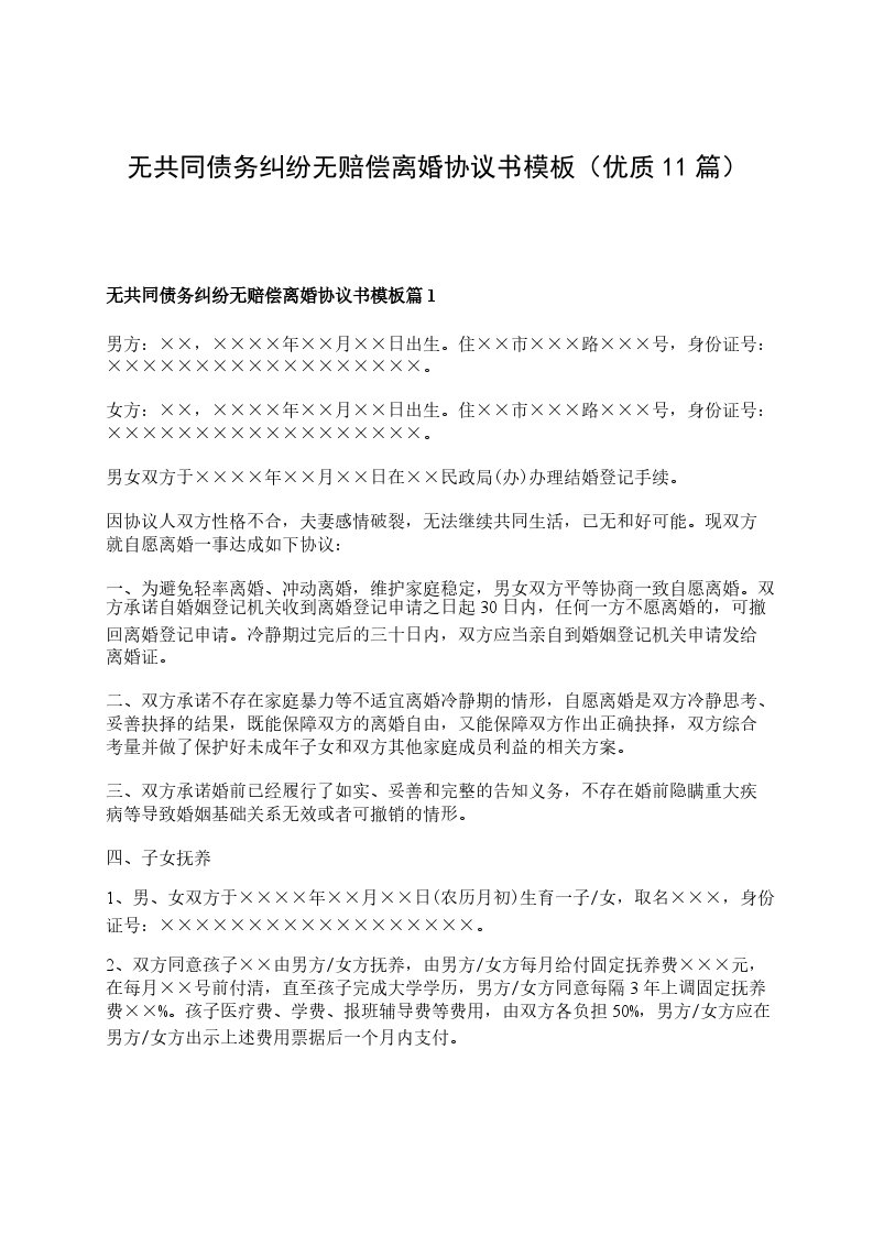 四、债务的处理:双方确认:在婚姻关系存续期间,夫妻双方不存在任何共同债务;任何一方如对外负有其他债务的,由负债方自行承担,与对方无关。