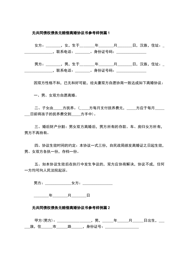1、甲乙双方确认在婚姻关系存续期间无共同债务;