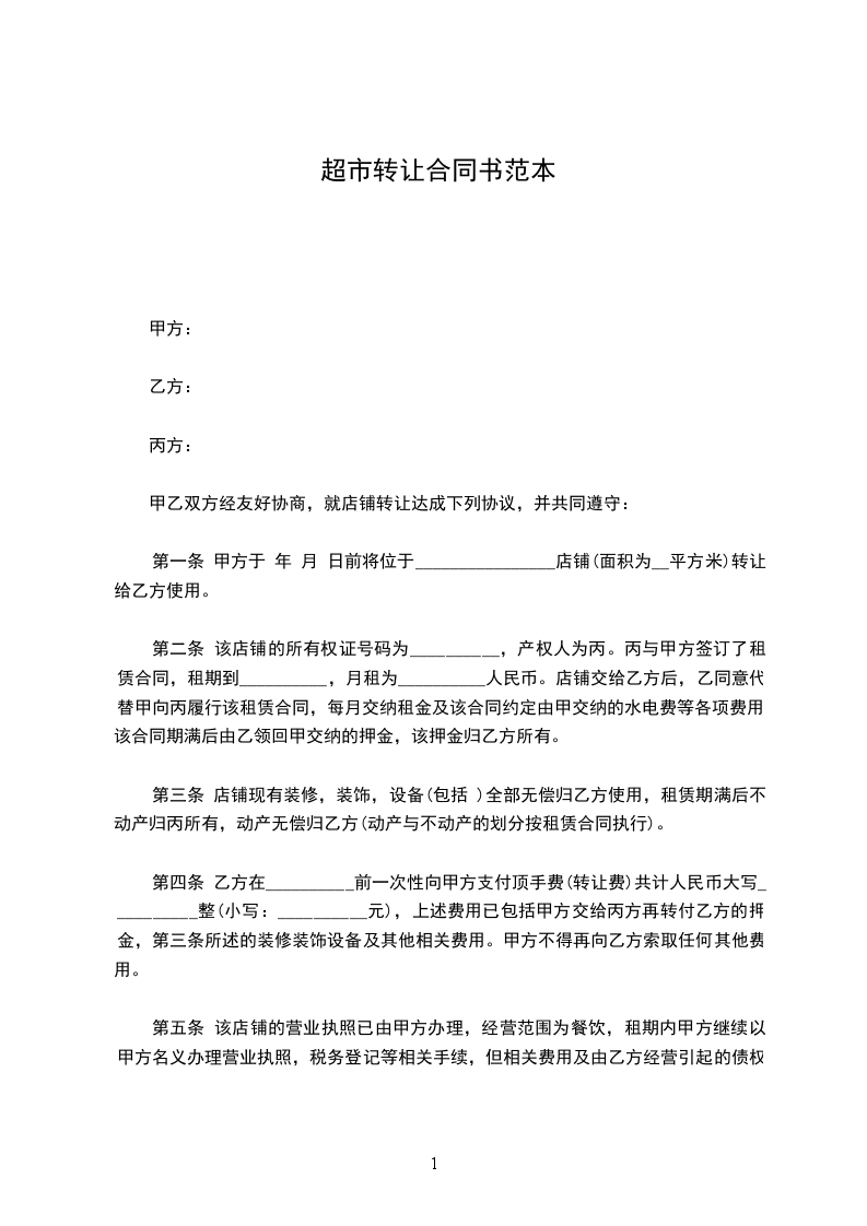 第一条 甲方于_______年_______月_______日前将位于________________店铺(面积为_________平方米)转让给乙方使用。