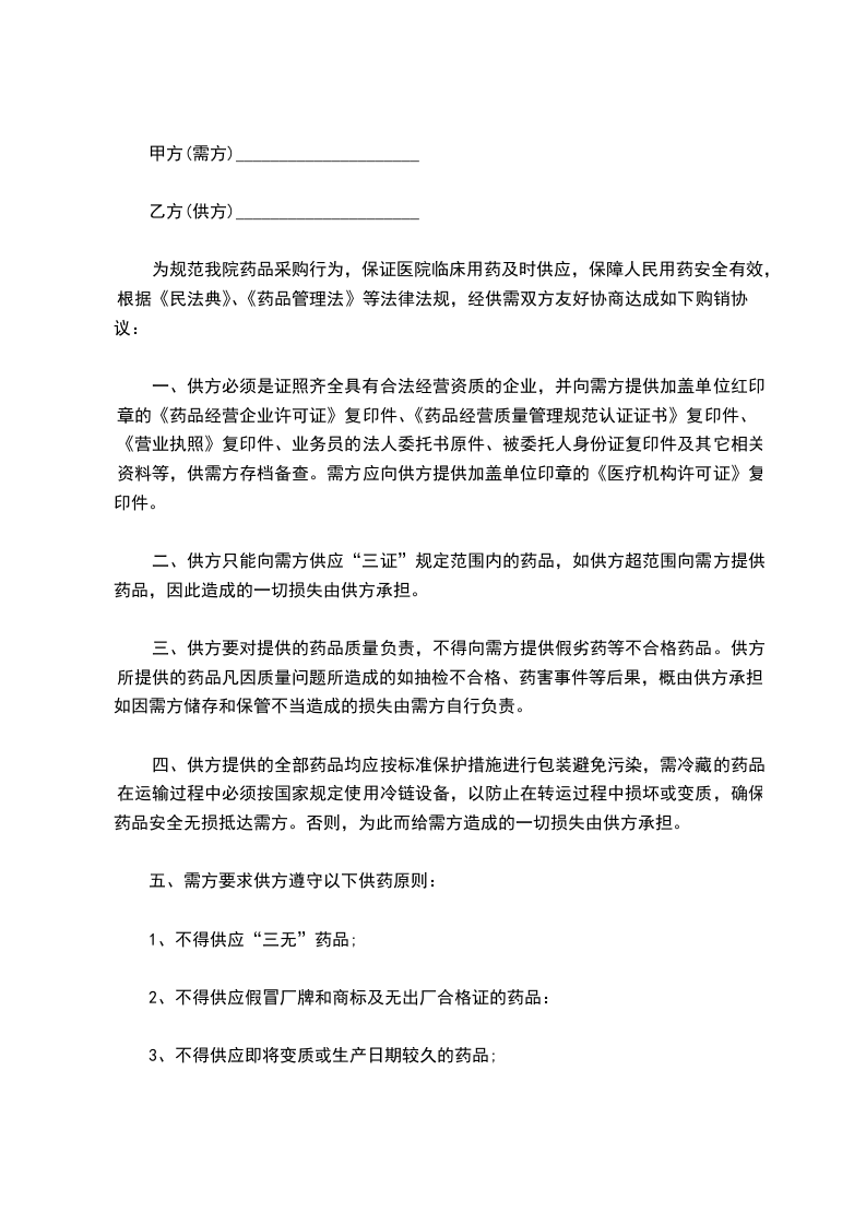 为规范我院药品采购行为,保证医院临床用药及时供应,保障人民用药安全有效,根据《民法典》、《药品管理法》等法律法规,经供需双方友好协商达成如下购销协议: