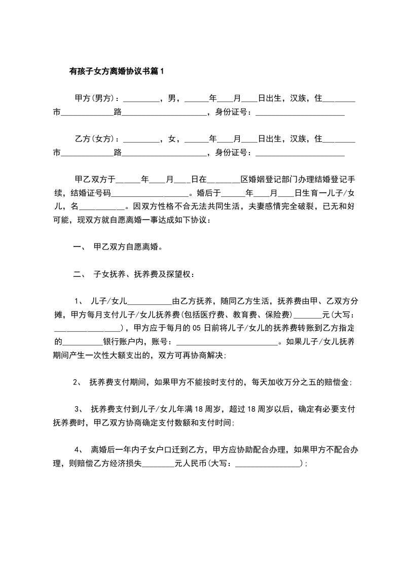 4、 离婚后一年内子女户口迁到乙方,甲方应协助配合办理,如果甲方不配合办理,则赔偿乙方经济损失________元人民币(大写:________________);