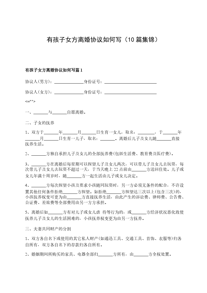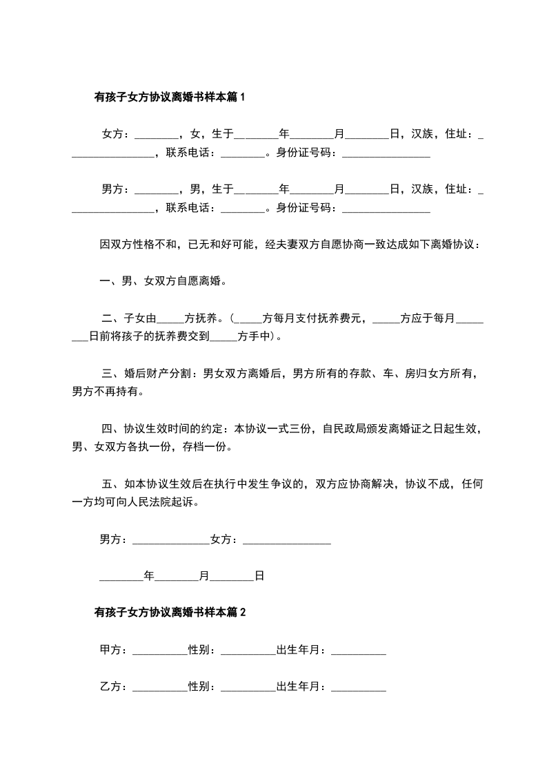 乙方(女方):_________,女,______年____月____日出生,汉族,住________市_____________路_____________________,身份证号:______________________