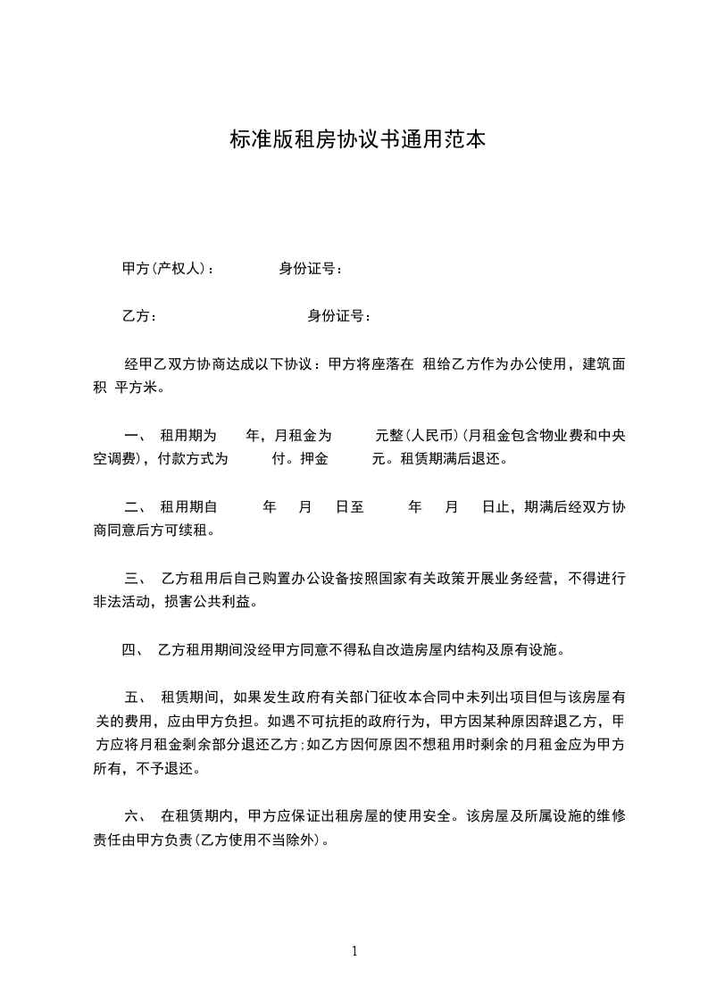 一、 租用期为 年,月租金为 元整(人民币)(月租金包含物业费和中央空调费),付款方式为 付。押金 元。租赁期满后退还。