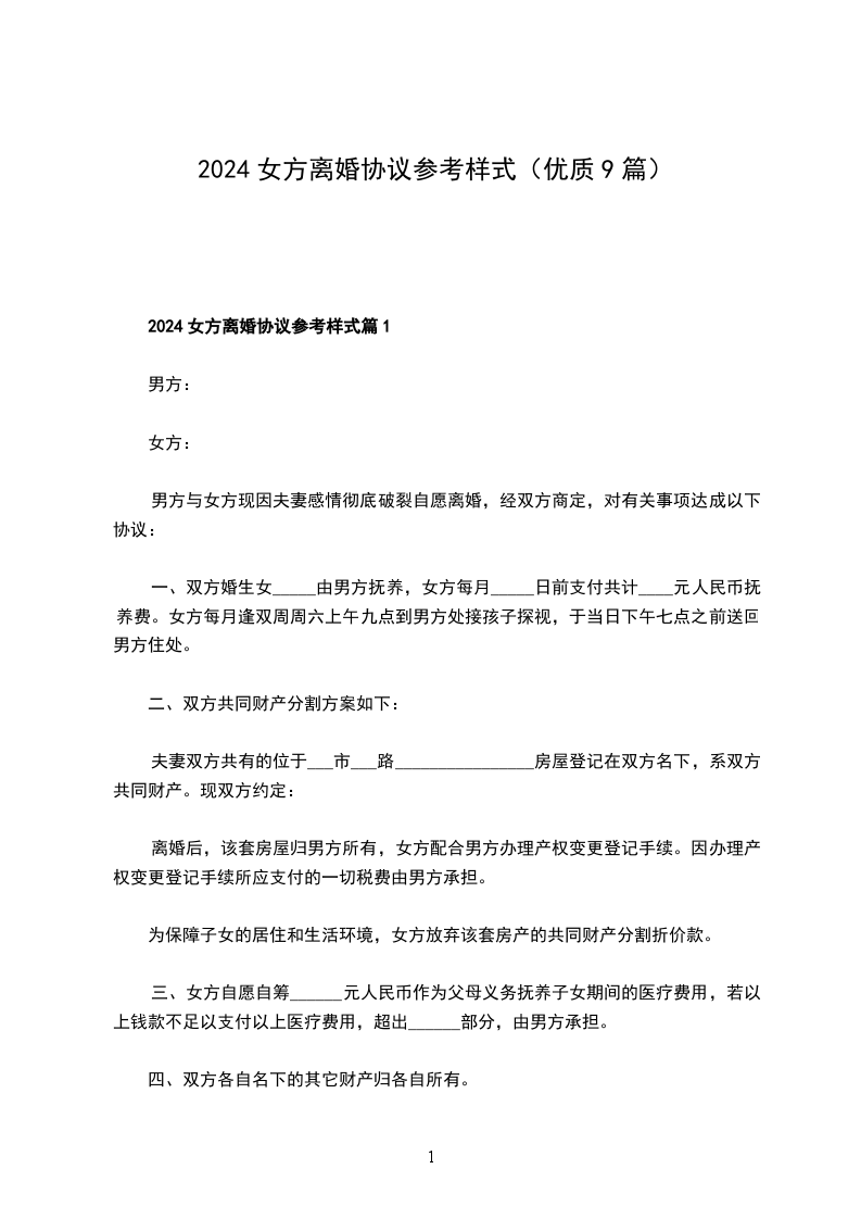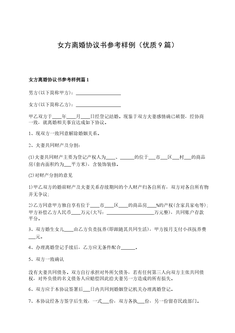 2024女方离婚协议参考样式篇9