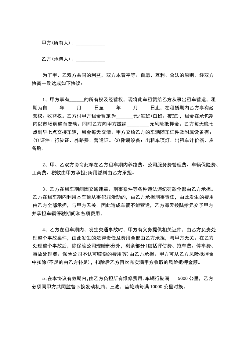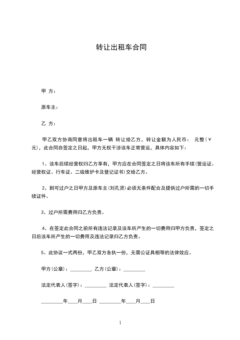 甲方和乙方在充分协商的情况下达成以下协议:甲方将本人拥有产权的一辆发动机号为:xxxx 的全新xxxx版出租车一辆转让给乙方,现签订本协议,供双方遵照执行: