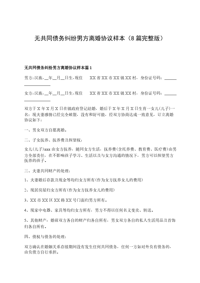 无债务纠纷男方协议离婚书范文篇8