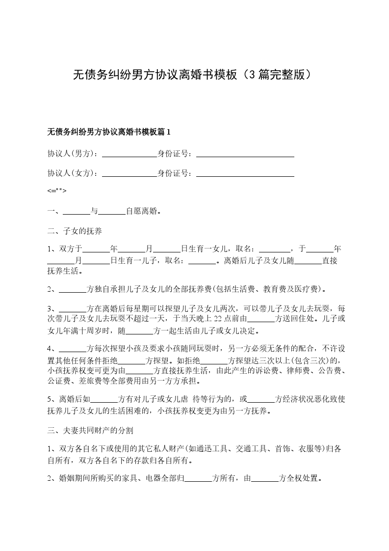 无债务纠纷男方协议离婚书范文篇2