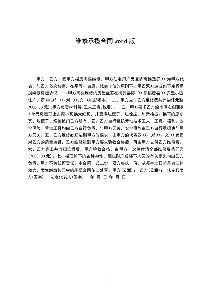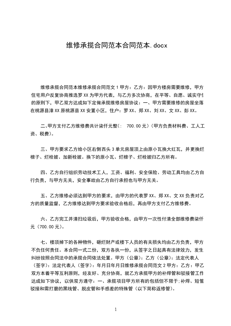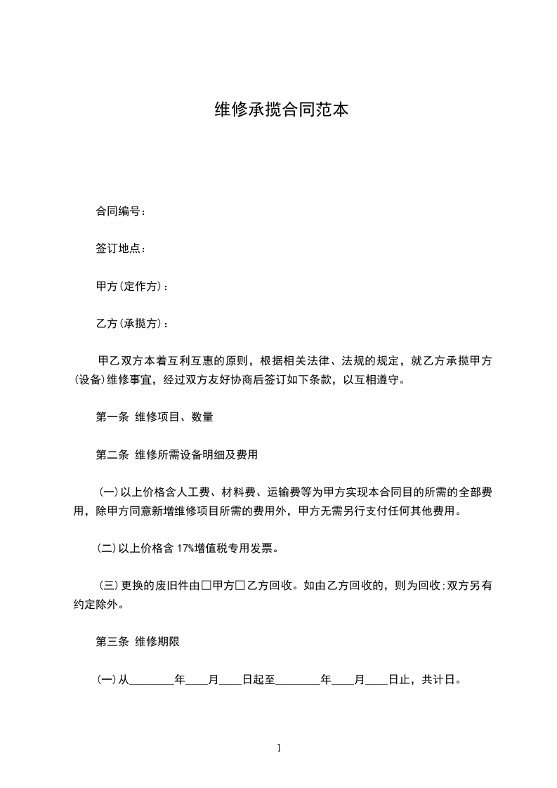甲乙双方本着互利互惠的原则,根据相关法律、法规的规定,就乙方承揽甲方(设备)维修事宜,经过双方友好协商后签订如下条款,以互相遵守。