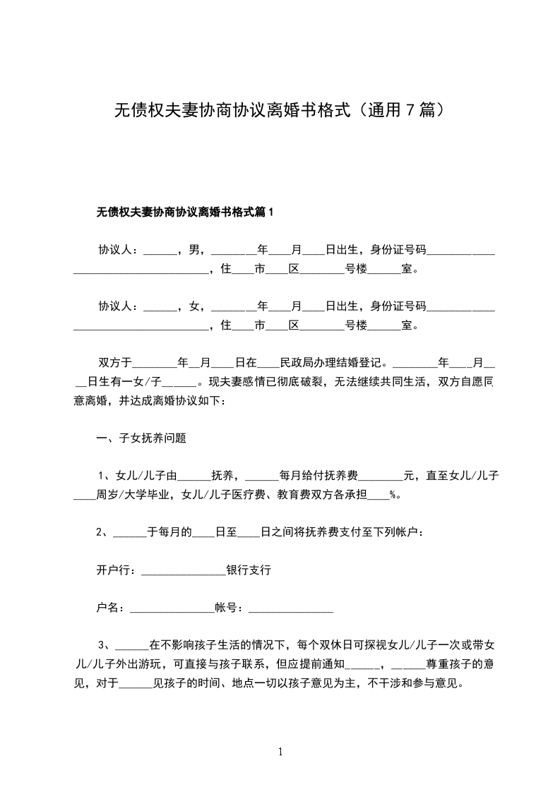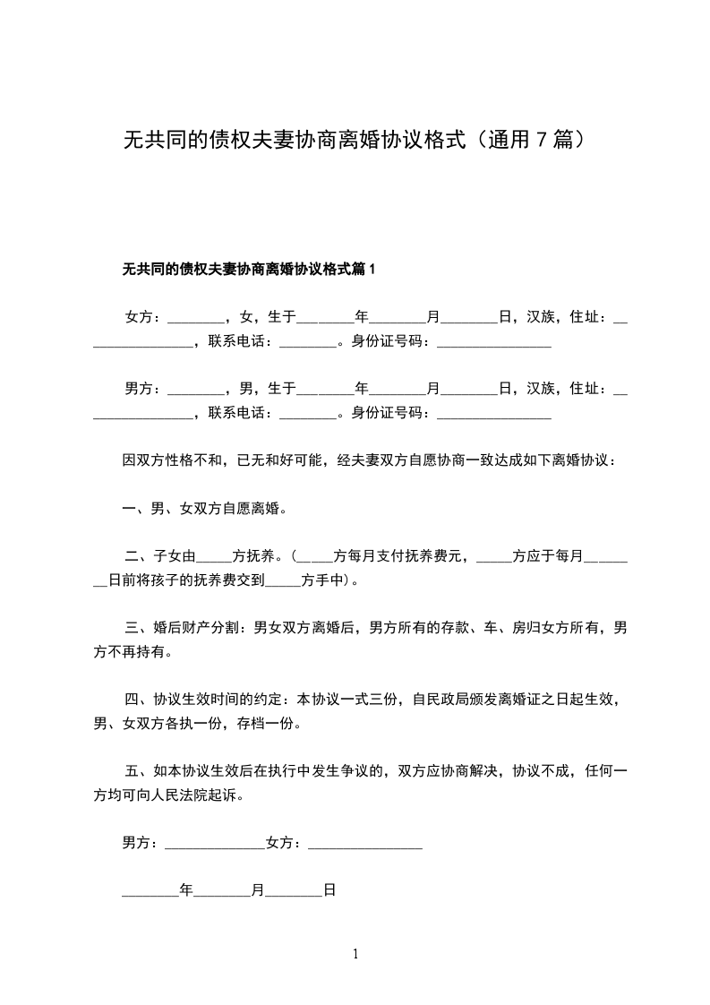 八、本协议一式三份,男、女双方各执一份,婚姻登记机关存档一份,自婚姻登记机颁发《离婚证》之日起生效。九、如本协议生效后在执行中发生争议的,双方应协商解决,协商不成,任何一方均可向相关人民法院起诉。