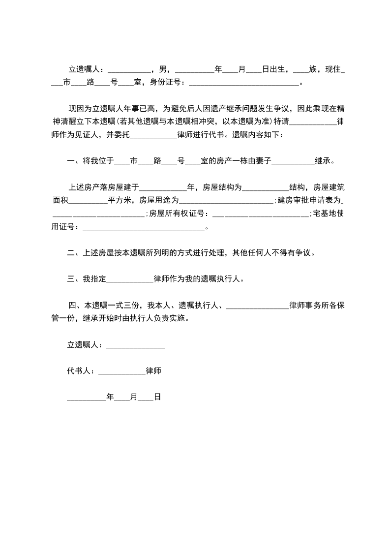 一、将我位于____市____路____号____室的房产一栋由妻子___________继承。