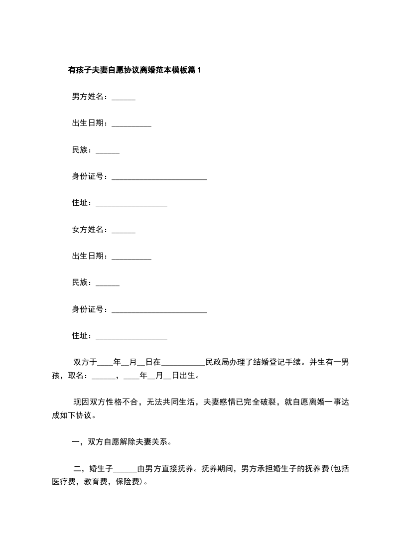 男方与女方于______年____月相识,并于______年____月____日在_________民政局登记结婚,婚后于______年____月____日生育一儿子,名_________。因____________________________致使夫妻双方感情破裂,且已无任何和好可能,现经双方自愿协商达成一致意见,订立离婚协议如下: