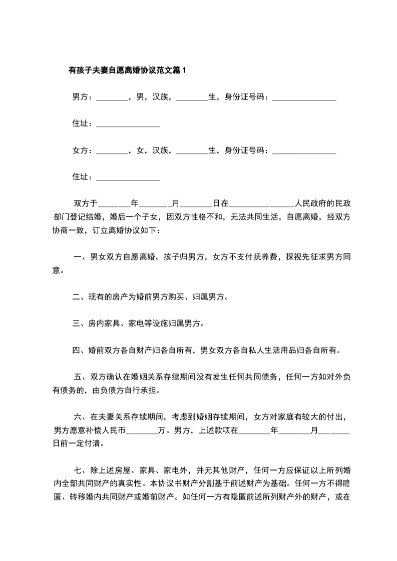双方于________年________月________日在________________人民政府的民政部门登记结婚,婚后一个子女,因双方性格不和,无法共同生活,自愿离婚,经双方协商一致,订立离婚协议如下: