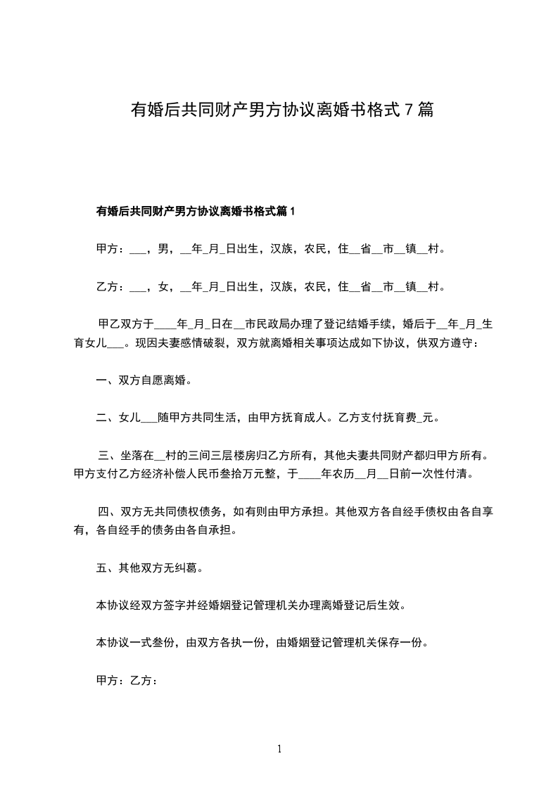 有婚后共同财产男方离婚协议怎么写篇7