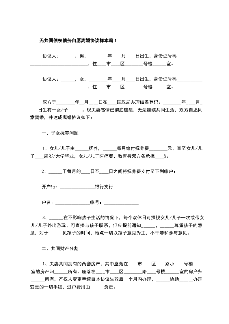 无共同债权债务自愿离婚协议样本篇1