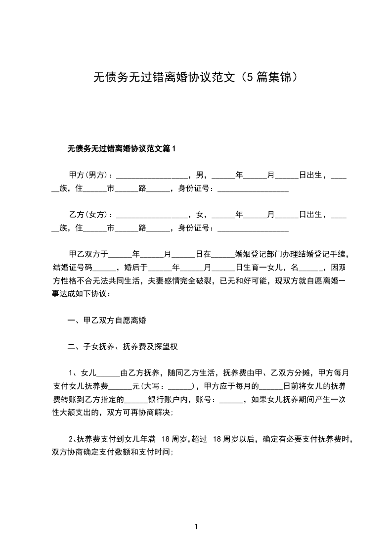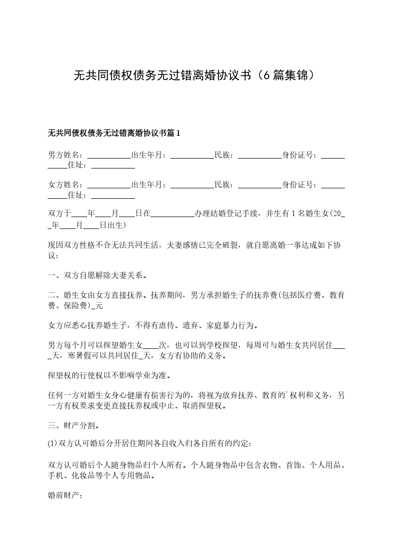 无债务无过错离婚协议范文篇5