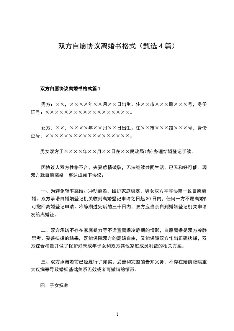 1、本协议一式三份,自婚姻登记机关颁发《离婚证》之日起生效,男、女双方各执一份,婚姻登记机关存档一份。