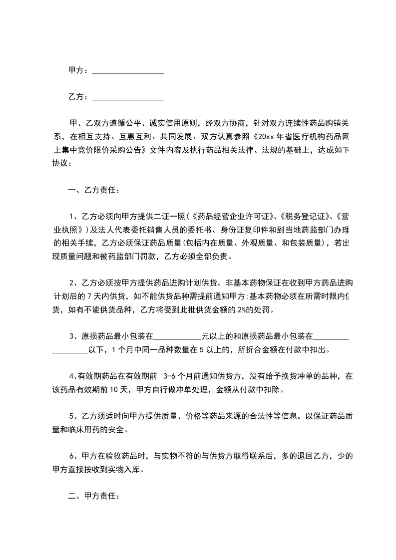 一、甲、乙双方本着真诚合作,诚信经营的原则,经协商达成药品购销合同书。双方承诺共同遵守。如因一方违反本合同书有关条款,给对方造成损失,违约方有责任赔偿对方损失。