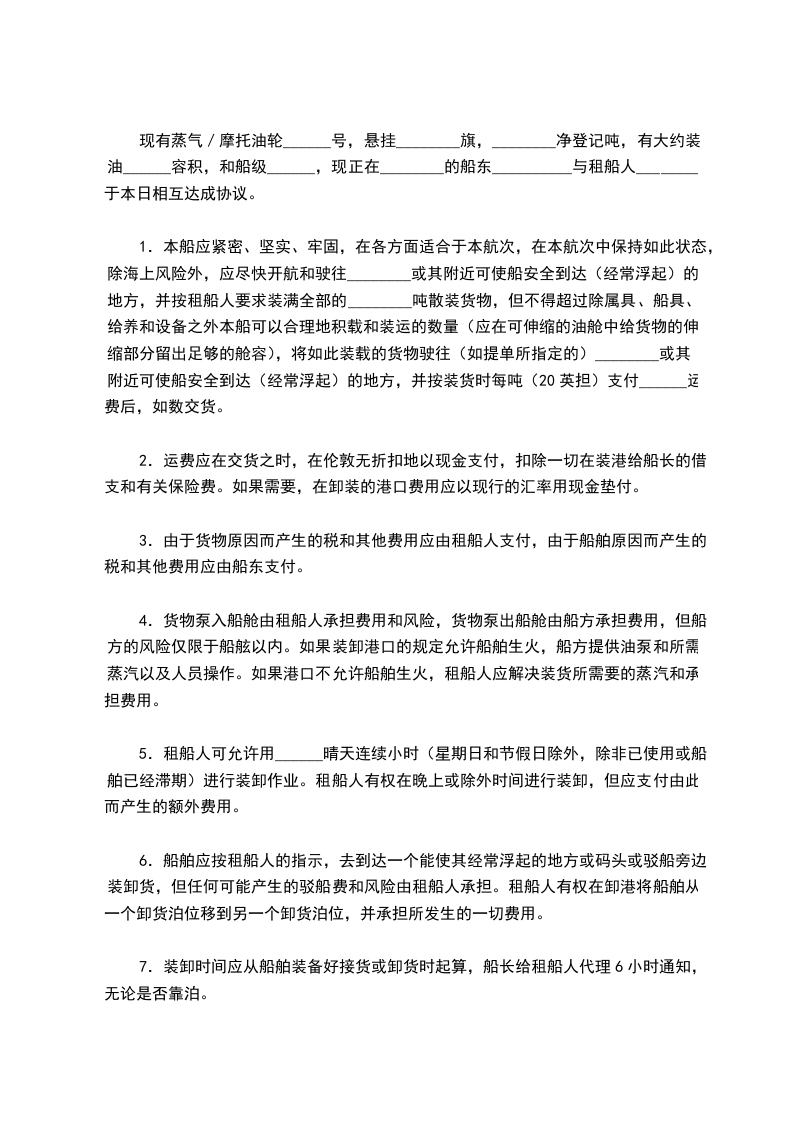 1.本船应紧密、坚实、牢固,在各方面适合于本航次,在本航次中保持如此状态,除海上风险外,应尽快开航和驶往________或其附近可使船安全到达(经常浮起)的地方,并按租船人要求装满全部的________吨散装货物,但不得超过除属具、船具、给养和设备之外本船可以合理地积载和装运的数量(应在可伸缩的油舱中给货物的伸缩部分留出足够的舱容),将如此装载的货物驶往(如提单所指定的)________或其附近可使船安全到达(经常浮起)的地方,并按装货时每吨(20英担)支付______运费后,如数交货。