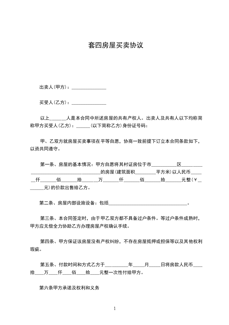 第五条、付款时间和方式乙方于__________年_____月_____日将房款人民币____拾____万____仟____佰____拾____元整一次性付给甲方。