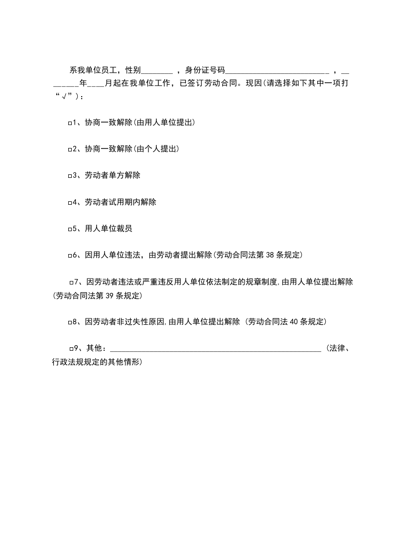 系我单位员工,性别________ ,身份证号码__________________________ ,________年____月起在我单位工作,已签订劳动合同。现因(请选择如下其中一项打“√”):