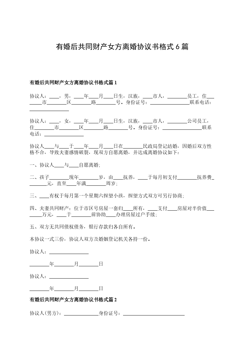 有婚后共同财产女方离婚协议书格式篇6