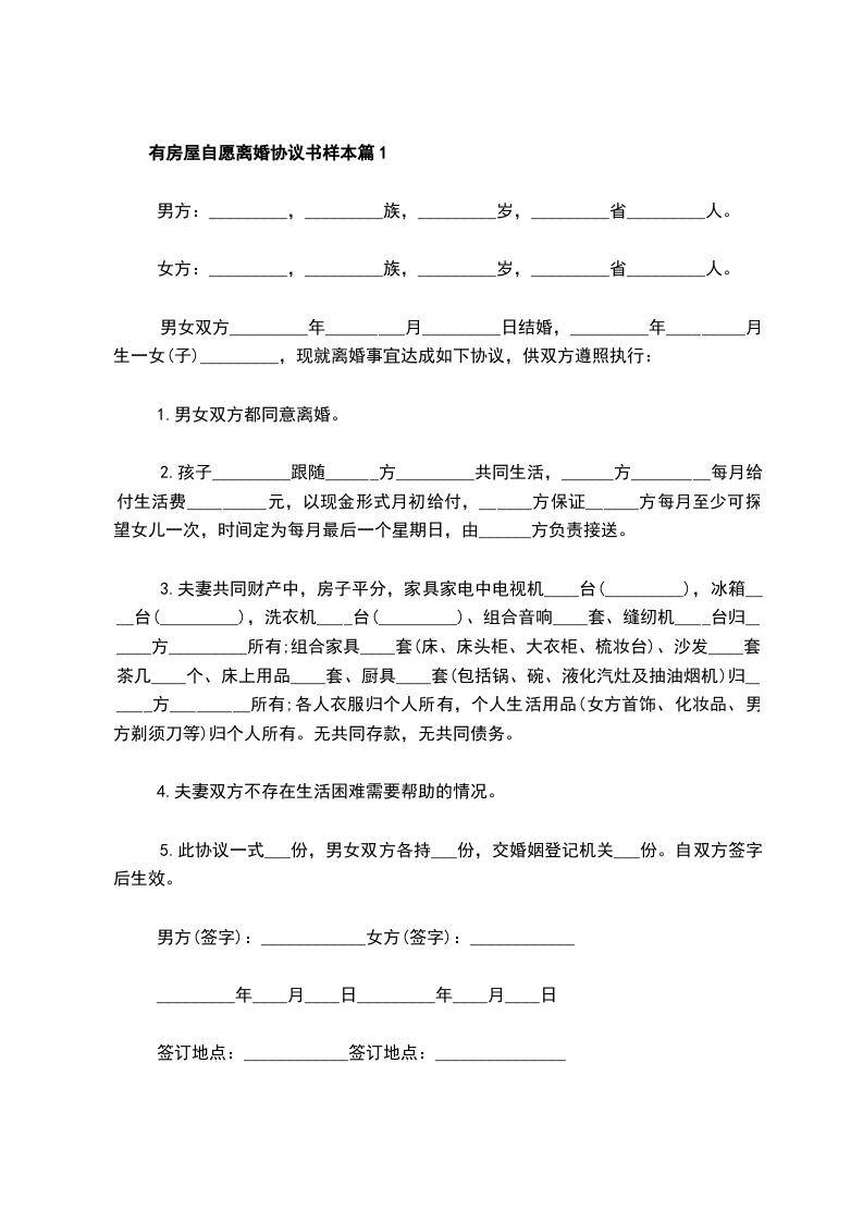 夫妻共有房屋内的家用电器及家具等,双方同意作价______万元,归男方/女方所有,取得的一方给予另一方经济补偿人民币______元,在本自愿离婚协议书样本签订之日起__内付清。