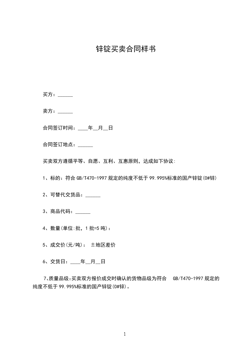 7、质量品级:买卖双方报价成交时确认的货物品级为符合GB/T470-1997规定的纯度不低于99.995%标准的国产锌锭(0#锌)。