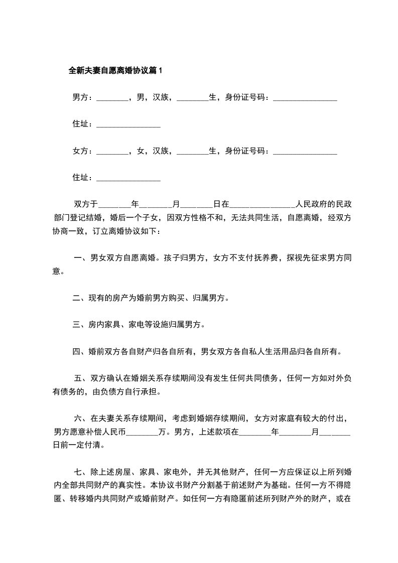 新版夫妻自愿协议离婚范本模板篇1