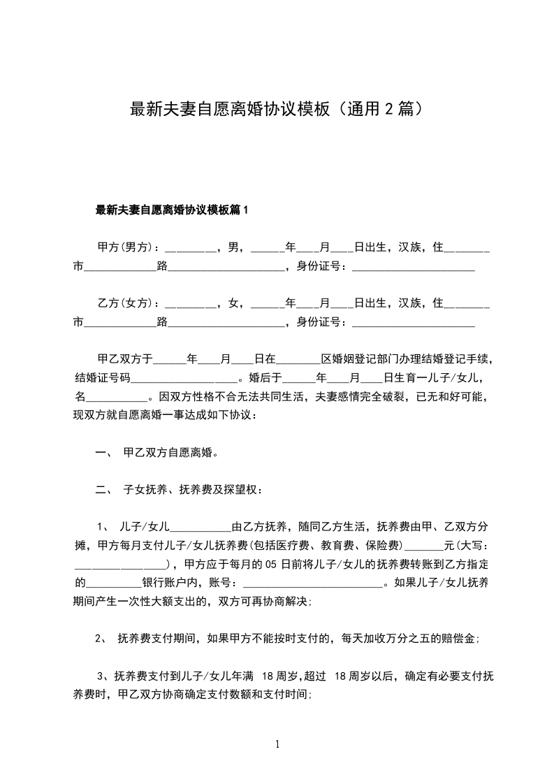 新版夫妻自愿协议离婚范本模板篇2