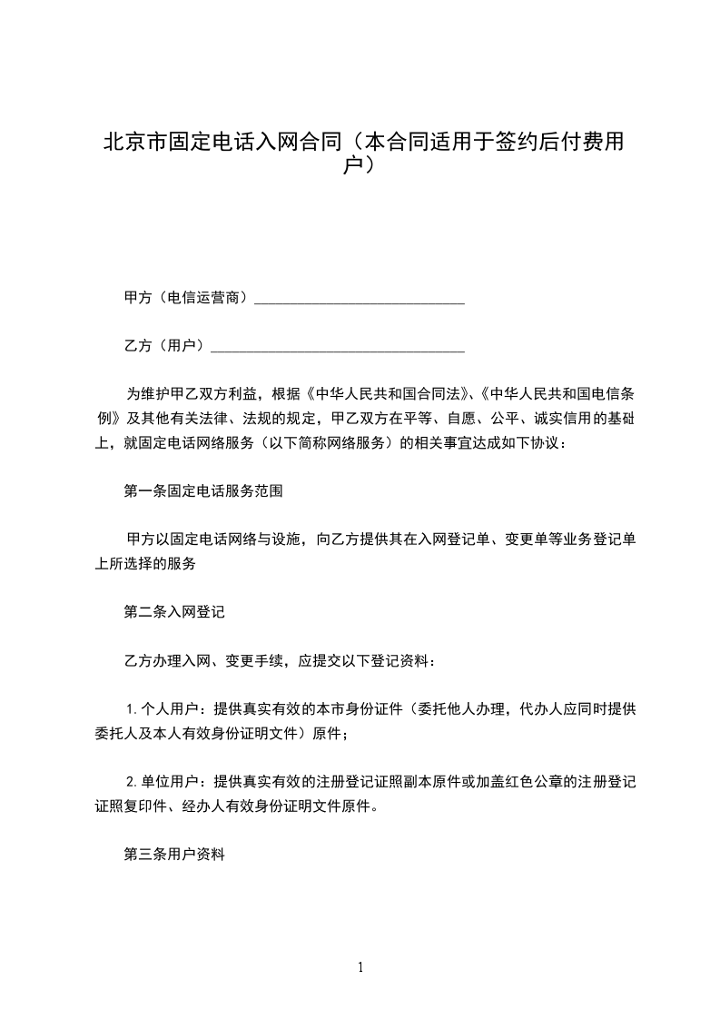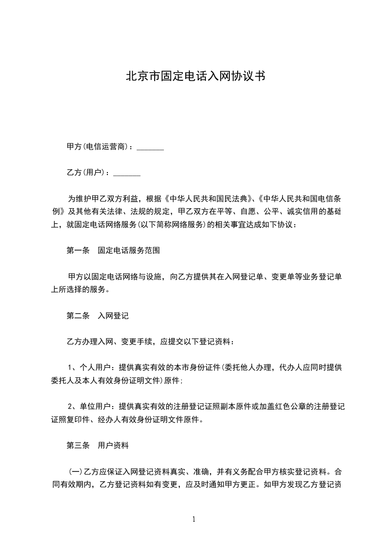 为维护甲乙双方利益,根据《中华人民共和国民法典》、《中华人民共和国电信条例》及其他有关法律、法规的规定,甲乙双方在平等、自愿、公平、诚实信用的基础上,就固定电话网络服务(以下简称网络服务)的相关事宜达成如下协议: