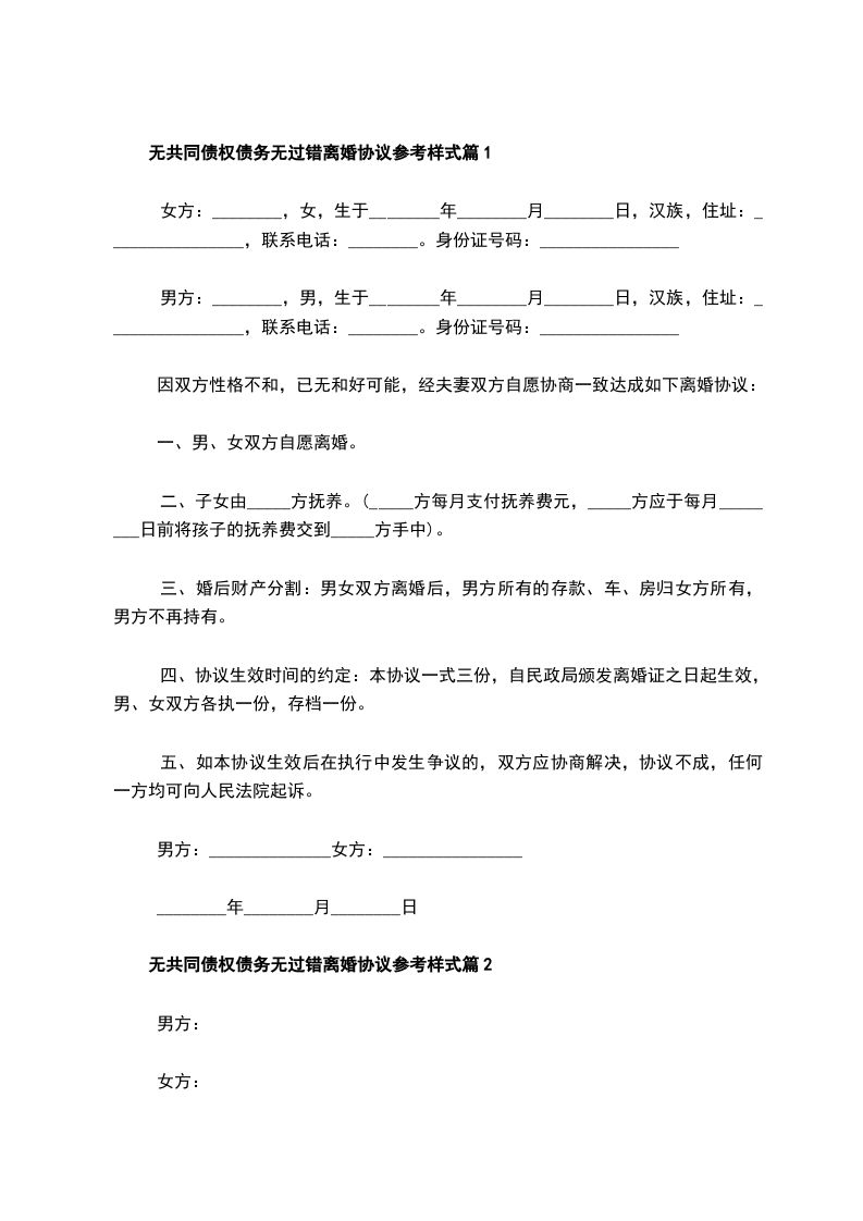 无共同债权债务无过错离婚协议参考样式篇2