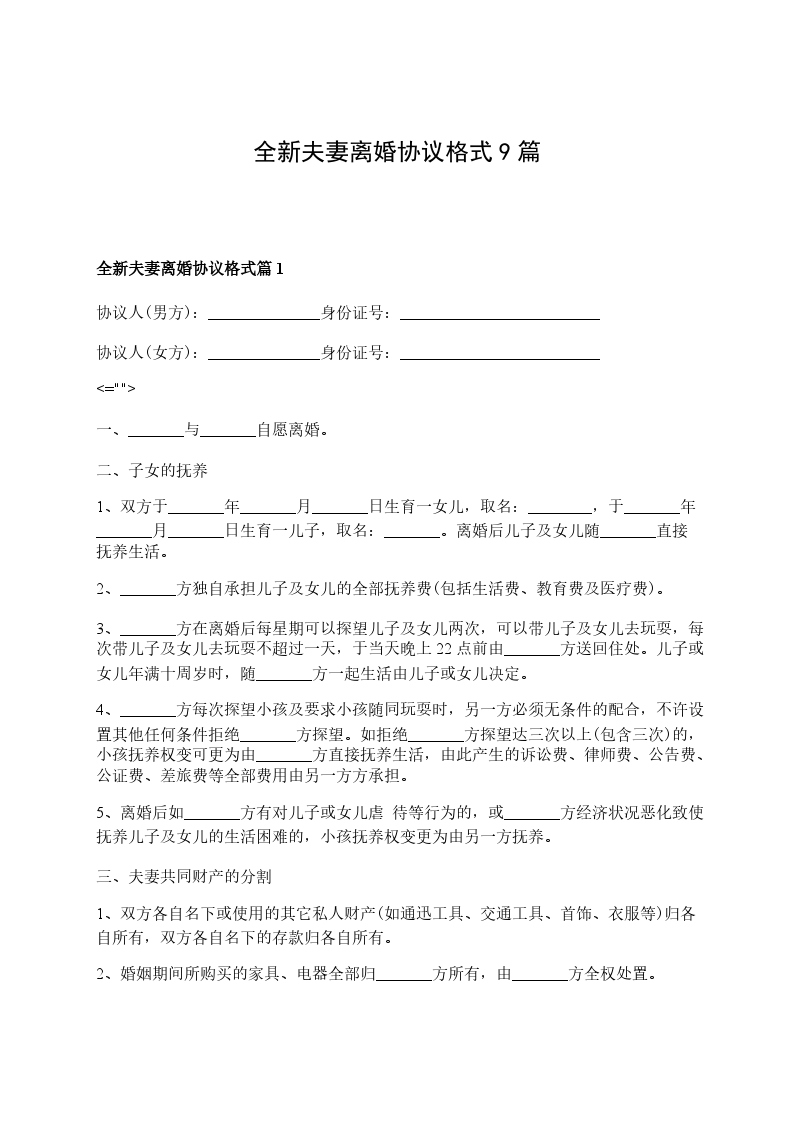 全新夫妻离婚协议书格式篇9